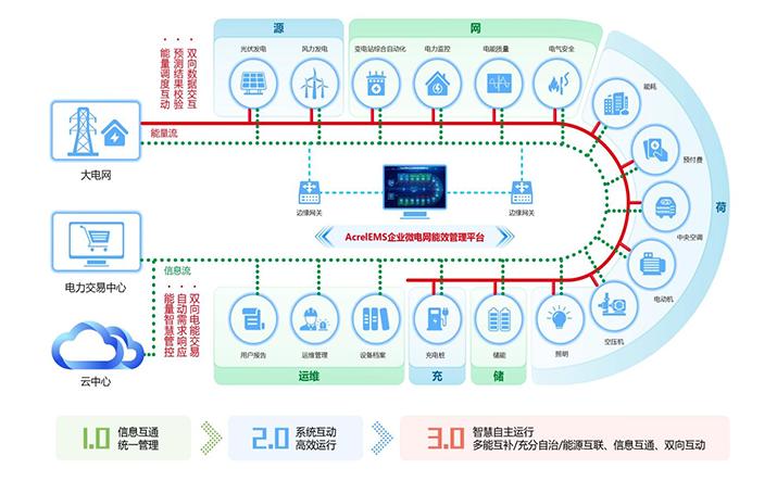 簡介:1.概述 通過在源、網(wǎng)、荷、儲、充的各個關鍵節(jié)點安裝監(jiān)測、分析、保護、治理裝置, 通過高性能邊緣計算網(wǎng)關采集數(shù)據(jù)并上傳至企業(yè)微網(wǎng)平臺。平臺根據(jù)新的電網(wǎng)價格、 用電負荷、電網(wǎng)調度指令等情況,調整各系統(tǒng)控制策略并遠程下發(fā),使企業(yè)微電網(wǎng)始終高效穩(wěn)定運行, 降低企業(yè)用電成本,實現(xiàn)能源互聯(lián)、信息互動。 2.應用場所 適用于各行業(yè)企業(yè)內部微電網(wǎng)管理系統(tǒng)的新建、擴建、改建等項目。 3.平臺結構 3.平臺功能 安科瑞AcrelEMS企業(yè)微電網(wǎng)能效管理平臺融合了電力監(jiān)控、電氣安全、照明控制、能源管控、充電樁運營管理、分布式光伏監(jiān)測、儲能管理、設備臺賬、運維管理等功能,通過一個平臺、一個APP整體的對企業(yè)用電進行集中監(jiān)控、統(tǒng)一調度、統(tǒng)一運維,并且根據(jù)當?shù)毓╇姴块T錯峰避峰計劃提前為企業(yè)制定錯峰避峰方案和預警,滿足企業(yè)